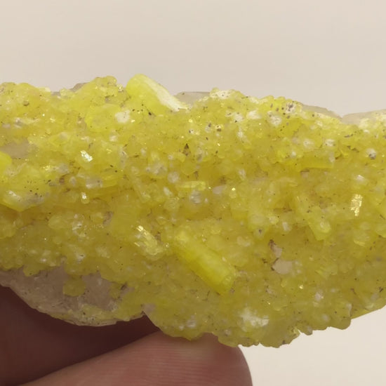 This stunning miniature specimen features bright, lemon-yellow Ettringite crystals elegantly perched atop a dramatic cathedral calcite host matrix. Sourced from the renowned November 2003 finds at the Wessels Mine in the Kalahari Manganese Fields, Northern Cape, South Africa, this piece captures one of the classic and highly sought-after mineral associations from this world-famous locality.